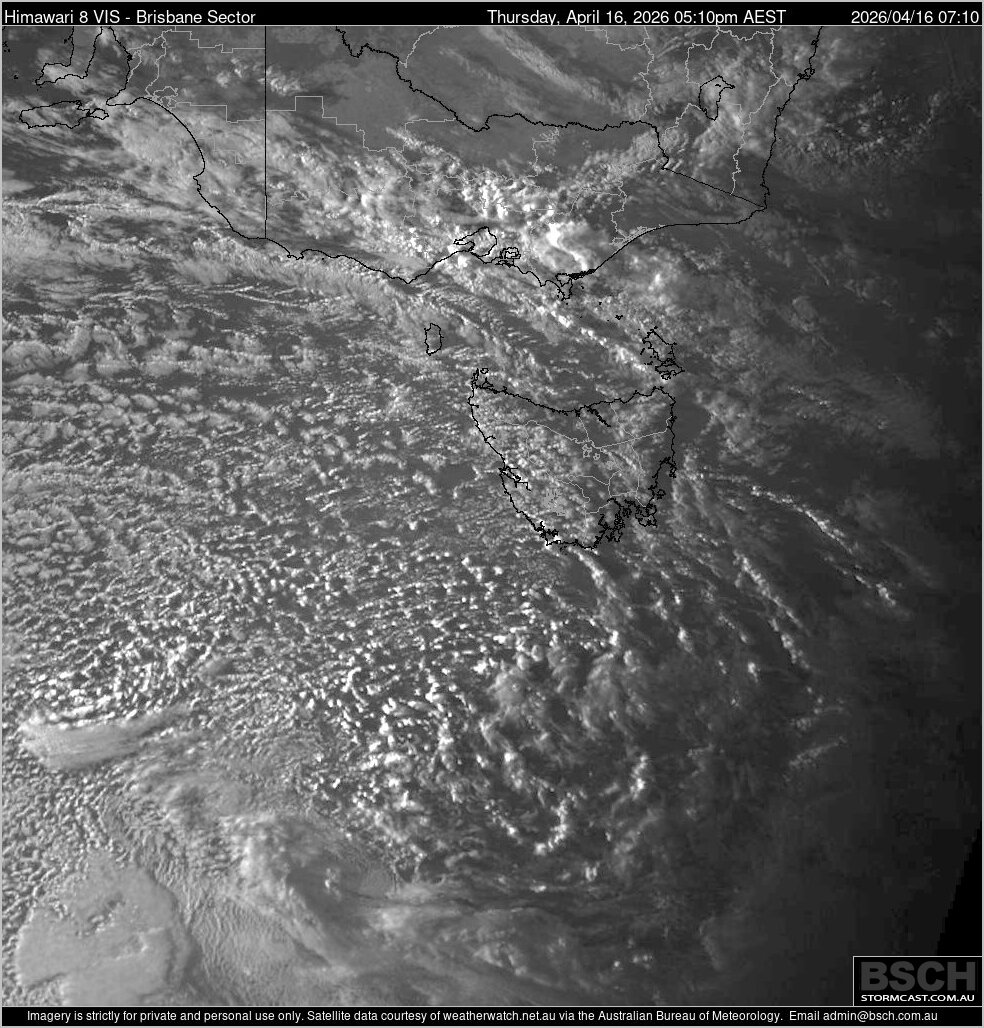 High resolution (1km) VIS satellite imagery from MTSAT-1R for the Australian region. Images are courtesy of the US Navy, update at around 20 minutes past the UTC hour (during daylight hours) and are archived for 14 days.